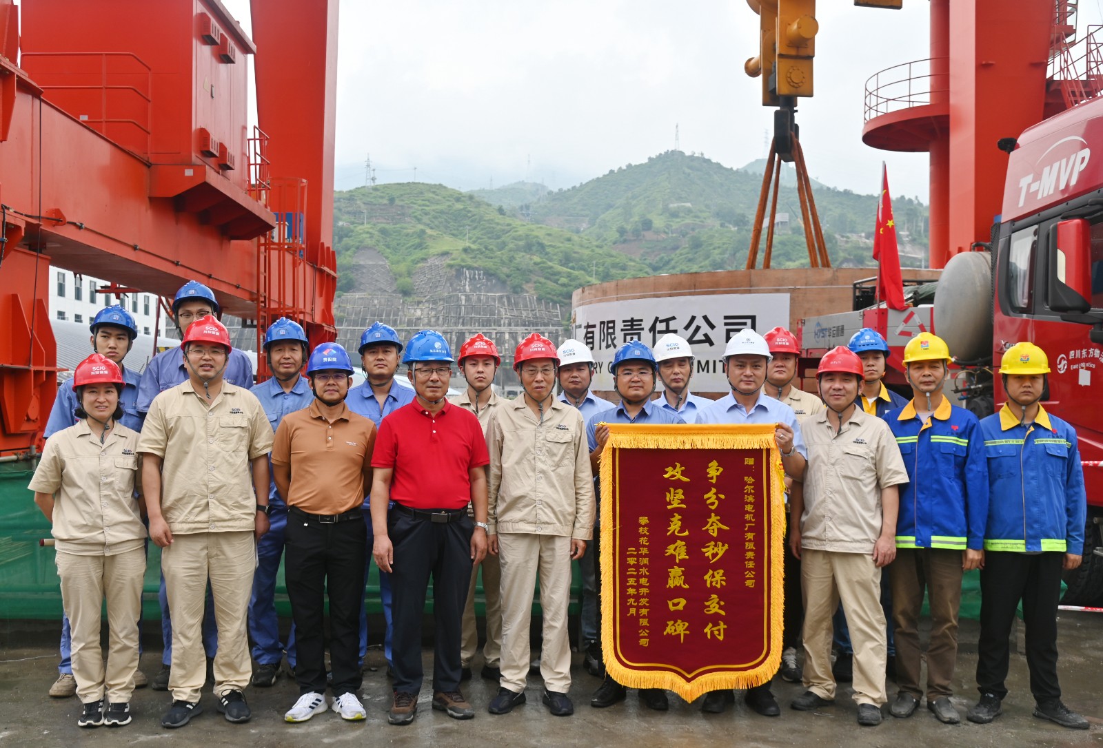 26日上午,现场各单位立即投入到吊装前的准备工作中。攀水电公司全程跟进机电安装进展,逐一确认安装条件;施工单位技术人员按吊装方案全面落实安全交底与技术措施,确保万无一失;在各项准备工作全面就绪的基础上,6号机组的转子支架平稳、精准吊装就位。J9九游会副总经理、攀水电公司党总支书记、董事长徐孝刚现场督导吊装工作,充分肯定了哈电公司在本次极端条件下的运输成绩,并向哈尔滨电机厂有限责任公司授予锦旗,感谢其长期以来对银江水电站建设的大力支持。