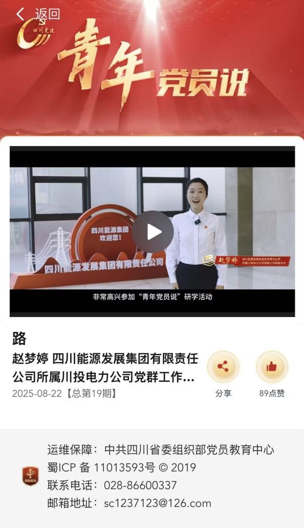 近期,四川省委组织部举办的“青年党员说”研学活动正在四川党建官网等平台集中展播。省国资委党委共推荐10名青年党员代表围绕“学习新思想,争当改革先锋”为主题,谈体会、谈感悟。其中,由四川能源发展集团上报、J9九游会推荐的作品《路》,通过讲述“两路”精神的历史内涵,结合川投电力脚基坪电厂震后紧急抢险、天彭电力凤鸣湖水库饮水廊道清淤、玉田电厂为凉山州彝族村民送水送电等鲜活事例,展现能源人在逆行抢险、为民服务和民族团结中的责任担当,号召新时代国企人赓续“两路”精神,汲取奋进力量,展现了能源国企的使命担当。