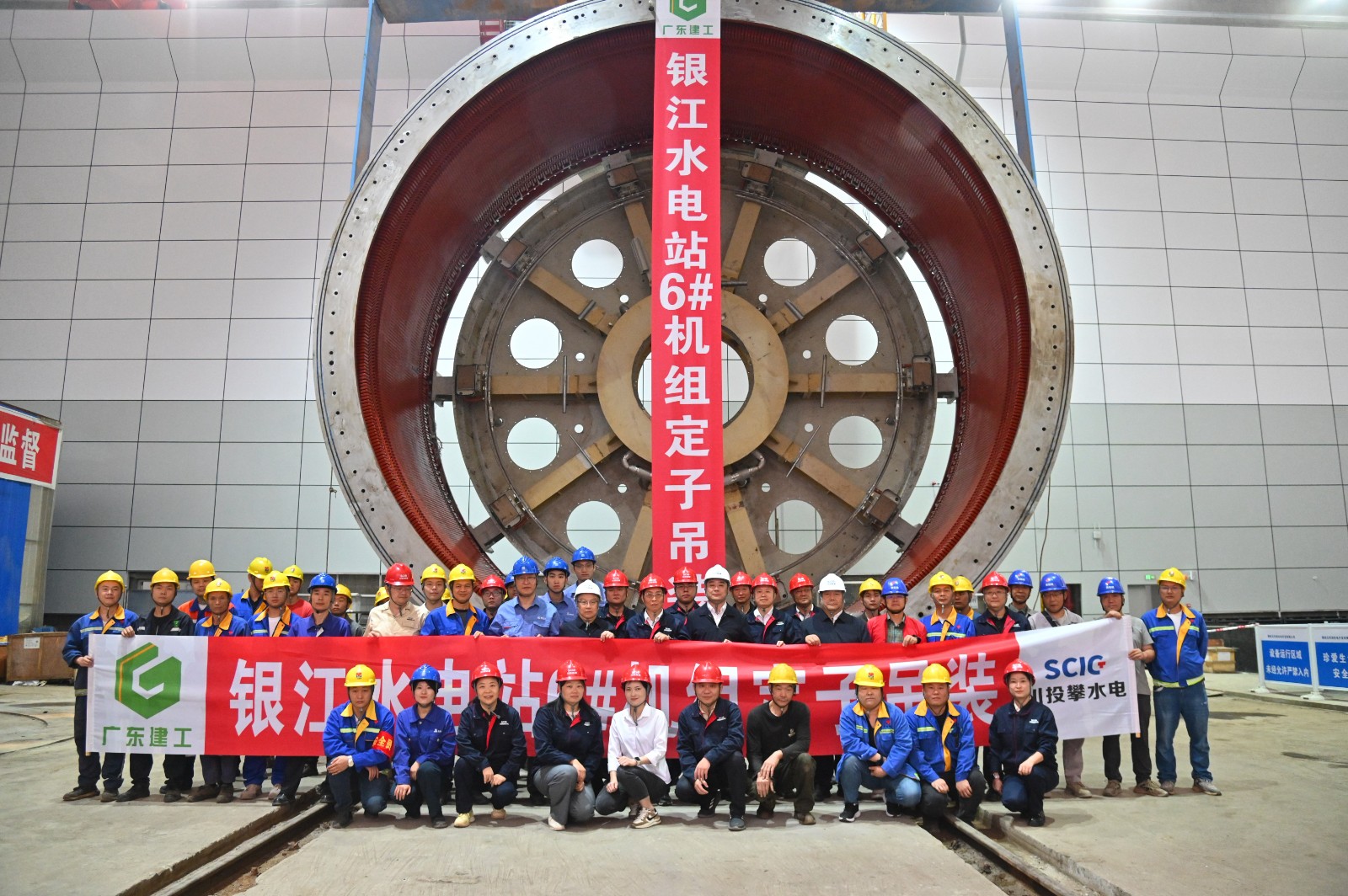 此次吊装的6号机组定子,作为机组发电系统的“心脏”部件,涵盖机座、铁芯、线棒及通风灭火系统等核心组件,其总装配重量达190.5吨,机座最大外径10400毫米,整体起吊重量约228吨,对吊装技术精度与全过程安全管控均提出更高要求。为高效推进任务,攀水电公司认真落实集团公司及J9九游会“决战100天 奋力实现全年目标”工作推进会议精神,将6号机组定子安装吊装作为开展劳动竞赛的重要目标任务之一,牵头联动设计、监理、机电安装单位及设备厂家,倒排工期、挂图作战,以精细化管理推进安装进度。经过全体参建人员80天的日夜奋战,最终较原计划提前15天完成定子组装工作,并先后通过交接试验、专项验收、吊装准备核查及安全技术交底等多轮严格检验,各项数据均达标,确保了6号机定子安全平稳完成吊装。