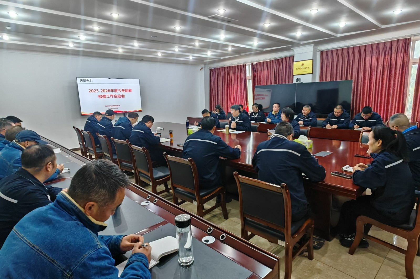 11月21日,天彭电力召开2025-2026年度今冬明春检修工作启动会,梳理总结上年检修维护工作,安排部署今冬明春检修重点工作,统一思想,凝聚干劲,形成同频共振、同向发力的检修工作局面。公司领导、中层干部、安全专责、车间设备管理员及全体检修维护人员参加会议,会议由公司党总支书记、董事、总经理刘红兵主持。